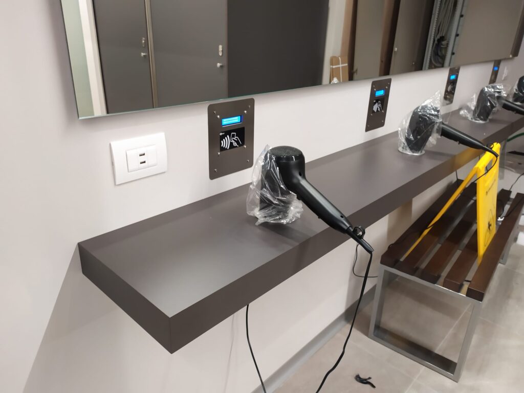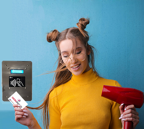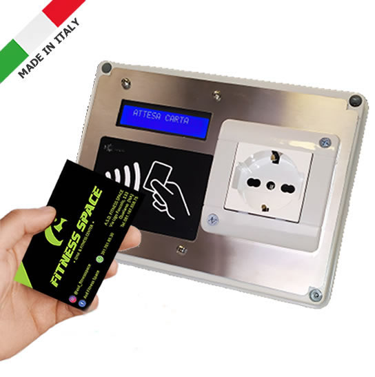 Può essere integrato con phon o con presa di corrente. Si attiva avvicinando la card al lettore RFID MIFARE, display retroilluminato con indicazione dei credito residuo e
